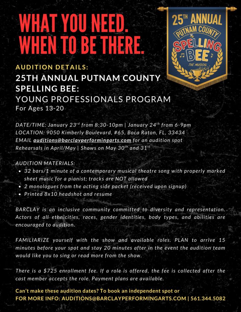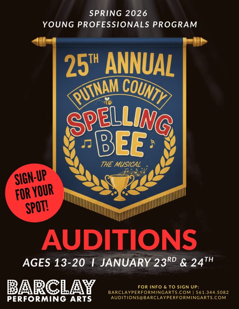 BARCLAY Performing Arts is proud to announce auditions for THE 25TH ANNUAL PUTNAM COUNTY SPELLING BEE in collaboration with The Find Your Voice Foundation. This production is a part of the BARCLAY Performing Arts Young Professionals Program, which brings training and working young artists through a professional show process from beginning to end.